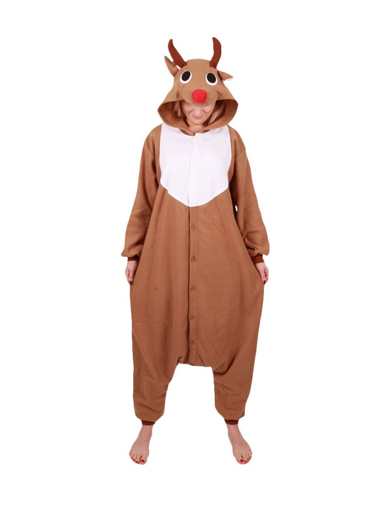 Schlüpfen Sie in den braun-weißen Rentier Onesie und tauchen Sie ein in die weihnachtliche und winterliche Atmosphäre. Mit seiner roten Nase verleiht dieser Onesie Ihrem Look einen charmanten Touch.