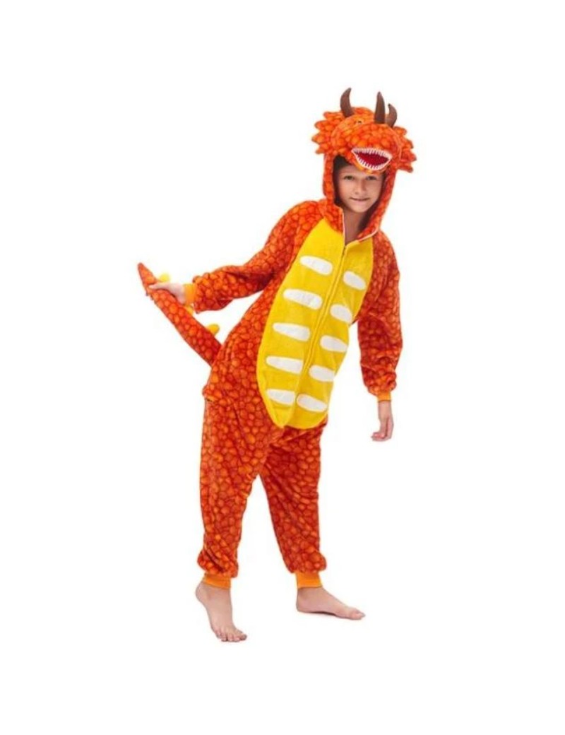Lassen Sie die Dinosaurier zum Leben erwachen mit dem Triceratorps Dinosaurier Kinder Onesie. In leuchtendem orange und gelb gehalten, verfügt dieser Onesie über ein faszinierendes Schuppenmuster und ein weißes Streifenmuster auf der Brust, das dem Outfit einen authentischen Look verleiht.