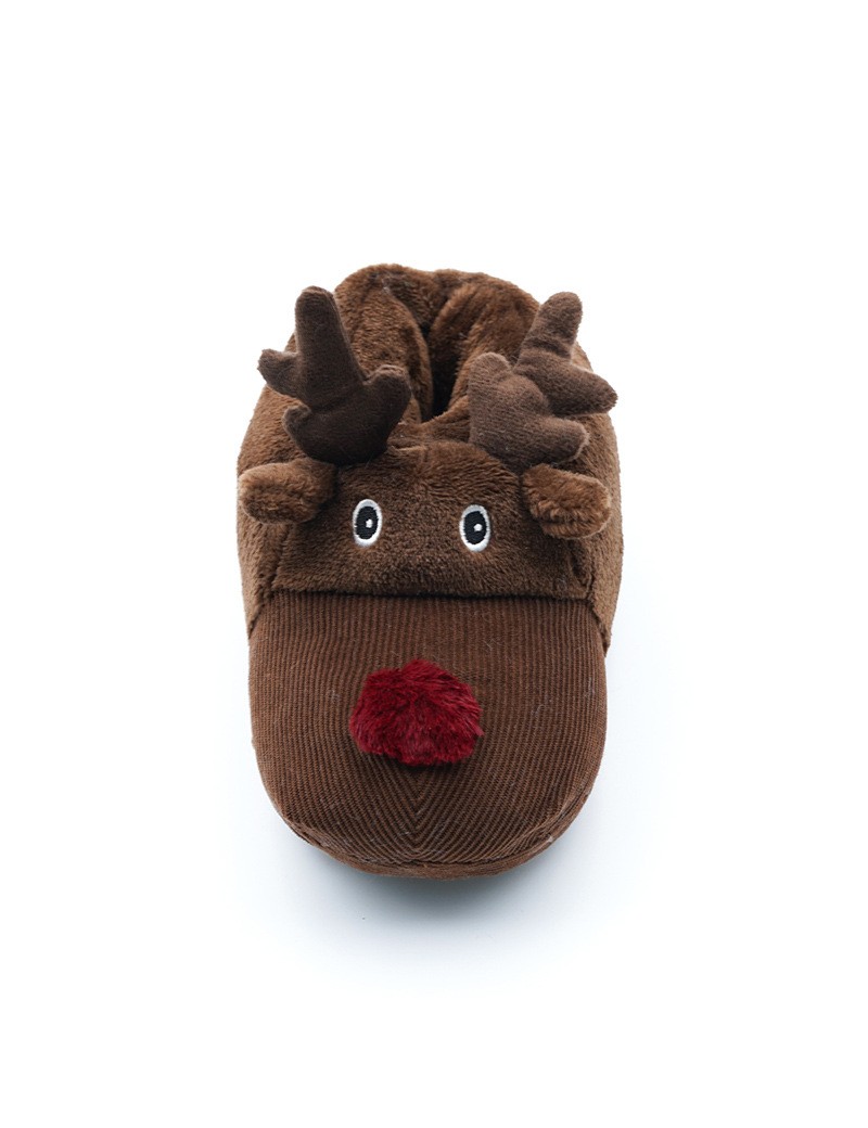 Dessa Brun Julälg-tofflor visar en röd pompom-nos och vackra festhorn.