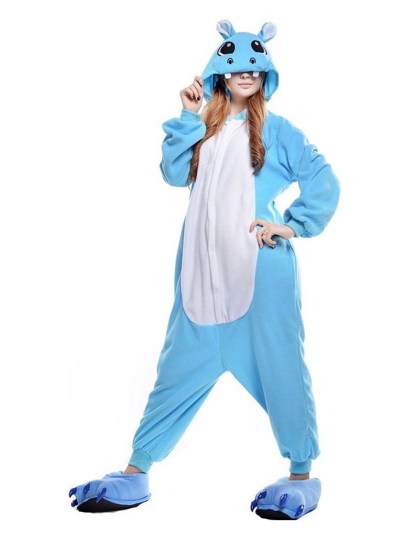 Flodhäst kigurumin finns i färgerna blå, grå och rosa.