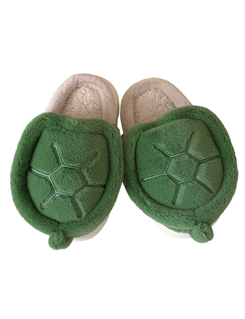 Sköldpadds-tofflor. Design framhäver stort texturerat skal på ovansidan och liten svans baktill, påminnande om djurets unika utseende. Lekfull och naturlig stil för avkoppling hemma.